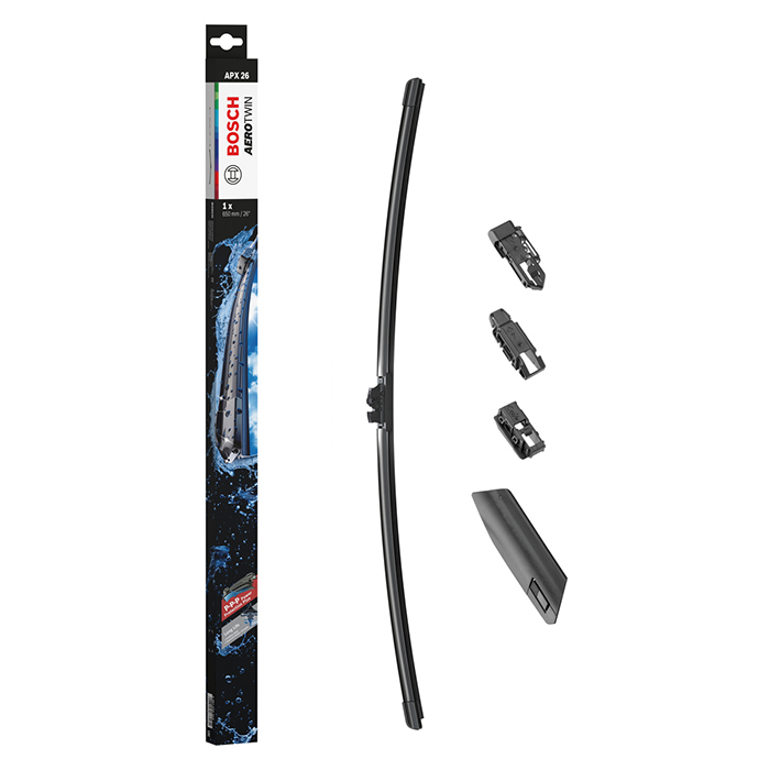 Sikrer uforlignelig viskeydelse selv under ekstreme vejrforhold: Bosch Aerotwin – flade viskerblade har patenteret Power Protection Plus-viskergummiteknologi med viskergummiformel til lang levetid.