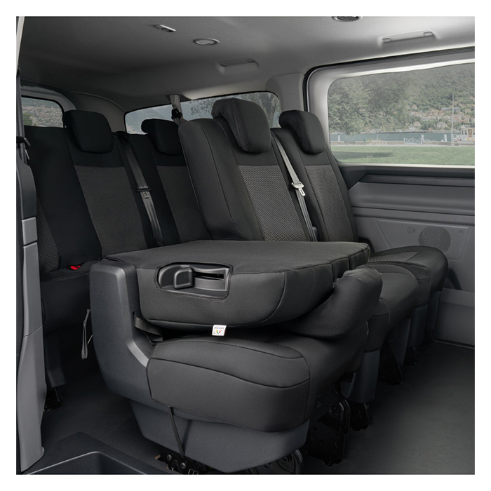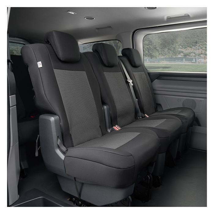 Disse sædeovertræk beskytter bilens originale polstring mod slid og skader, mens det klassiske og stilrene design giver et æstetisk løft. Den afdæmpede farvekombination af sort, med en diskret grå tekstur midt i betrækket, passer harmonisk ind i ethvert bilinteriør. En af fordelene ved betrækkene er, at de dækker hele bagsiden af ryglænet.