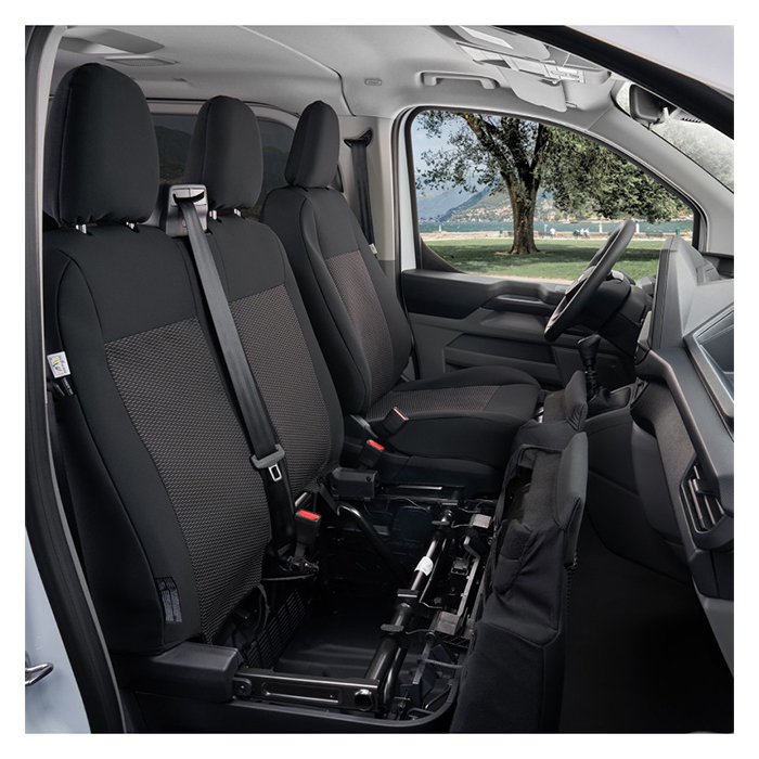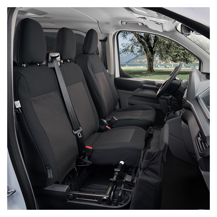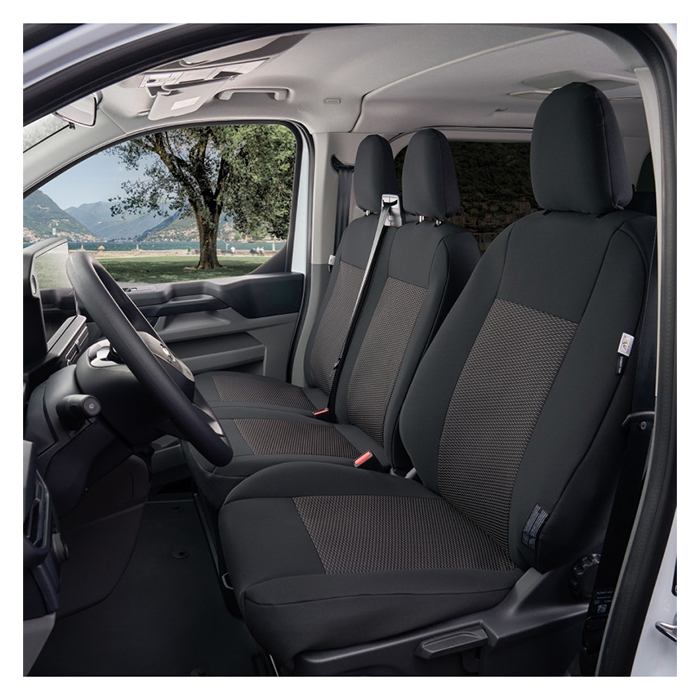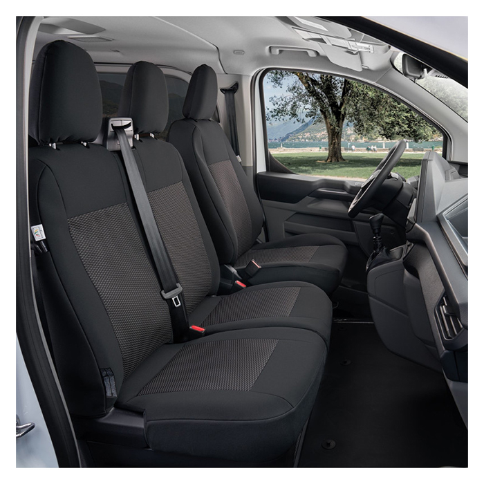 Disse sædeovertræk beskytter bilens originale polstring mod slid og skader, mens det klassiske og stilrene design giver et æstetisk løft. Den afdæmpede farvekombination af sort, med en diskret grå tekstur midt i betrækket, passer harmonisk ind i ethvert bilinteriør. En af fordelene ved betrækkene er, at de dækker hele bagsiden af ryglænet.