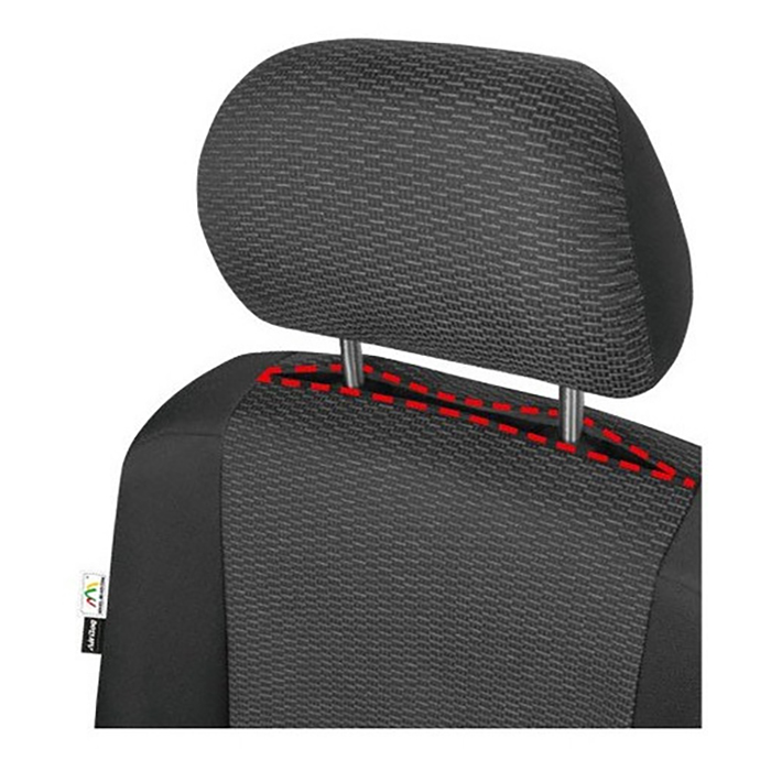 Overtrækket er fremstillet af slidstærkt jacquardstof med en indvendig PUR-skumlaminering, som forhindrer glidning og sikrer lang holdbarhed. Det er kompatibelt med biler, der har sideairbags, takket være den innovative sikkerhedssøm, der åbner sig ved en kollision. Den mørke, stilrene farve giver et eksklusivt udtryk og passer ind i ethvert køretøjs kabine. Monteringen er enkel og kræver ingen specialværktøj – de medfølgende klips og en illustreret vejledning gør det hurtigt og nemt at installere.