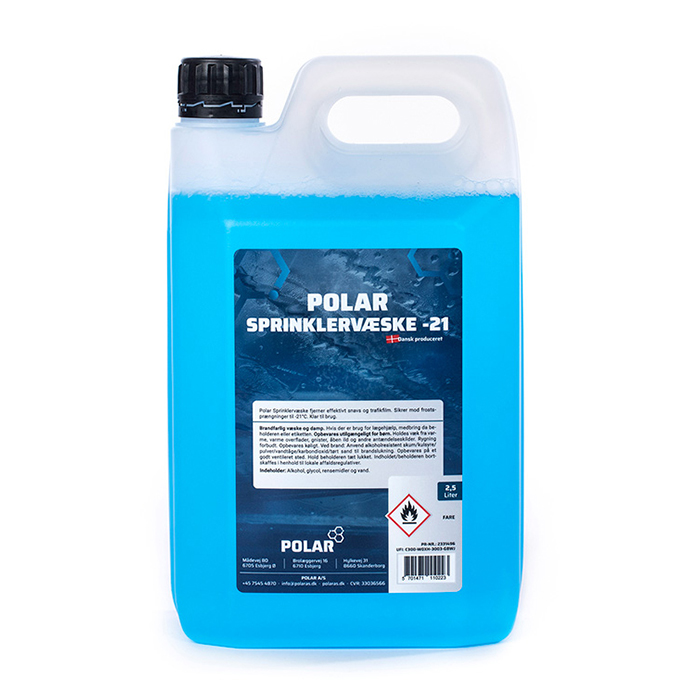 Færdigblandet Polar sprinklervæske til vinterbrug, som tåler ned til -21 °C. Den fjerner effektivt snavs, trafikfilm, salt og insekter fra bilens for- og bagrude. Undgå at sprøjte væsken på en kold rude – vent, til blæseren har varmet den op. Produktet er uskadeligt for krom, hærdet lak og gummi og danner først iskrystaller ved omkring -13 °C.