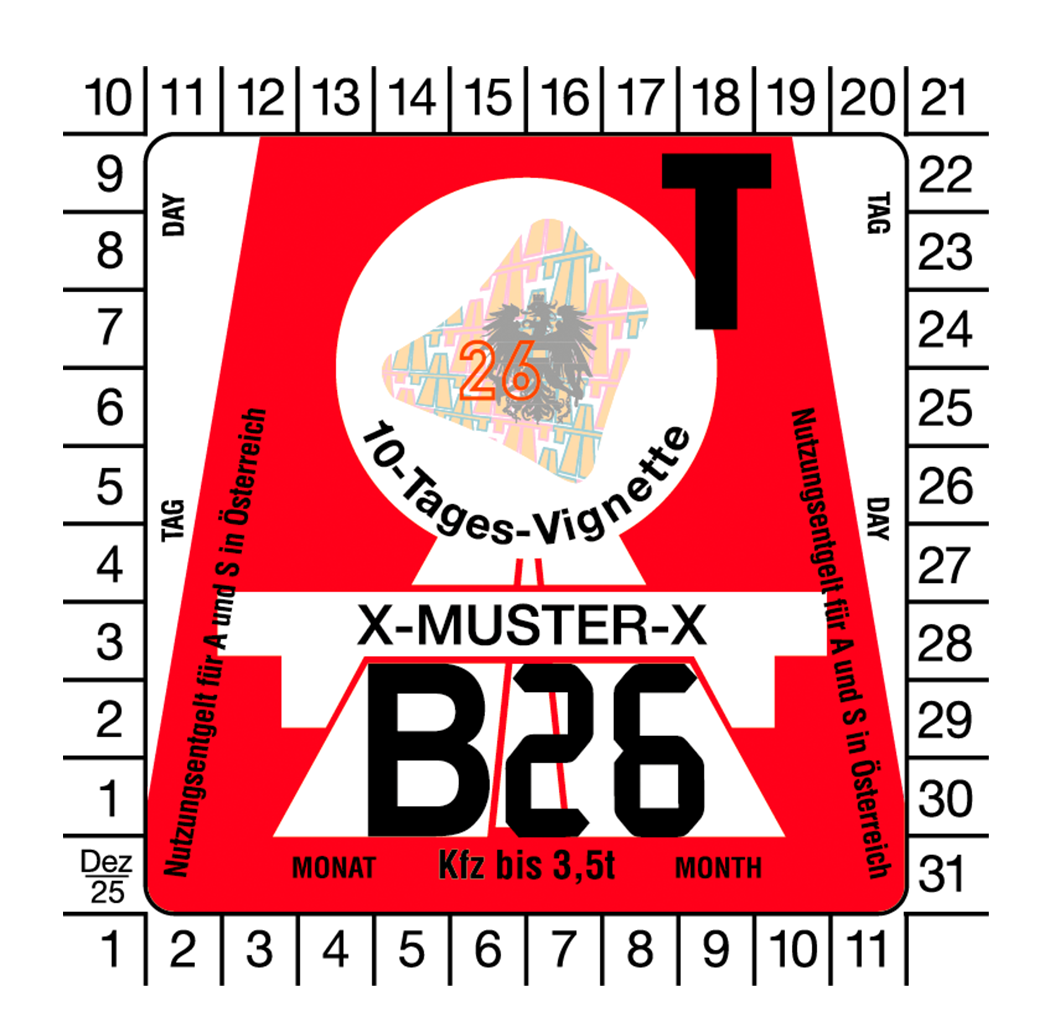 Motorvejsmærkat Østrig 2026 gælder i 10 dage er et obligatorisk motorvejs vignette til kørsel på de østrigske motorveje og motortrafikveje.