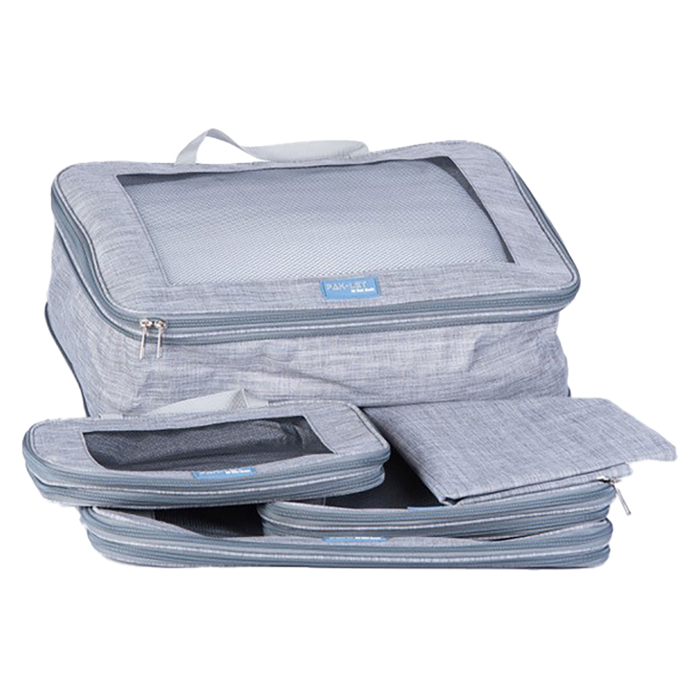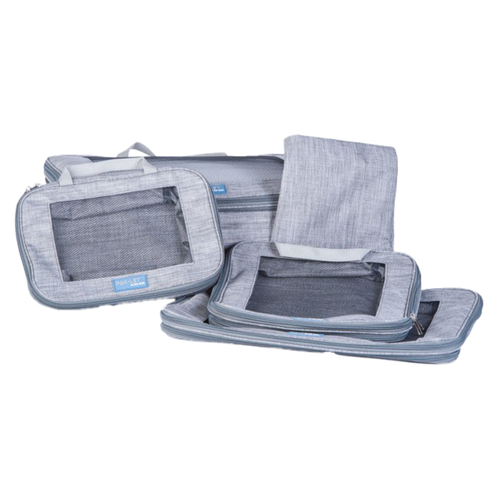Sættet består af tre rummelige packing cubes i forskellige størrelser og én stor vaskepose med snørelukning. De enkelte poser kan bruges hver for sig – eller stables for optimal udnyttelse af pladsen. Mesh-toppen sikrer ventilation og gør det nemt at se indholdet uden at åbne poserne.