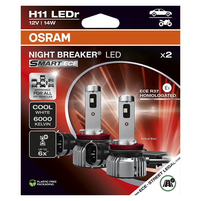 Med Osram Night Breaker LED H11 kan du nu opgradere dine originale pærer til den nyeste LED-teknologi til brug på vejene. Disse LED-udskiftningslamper er velegnede som erstatning for konventionelle H11-pærer.
