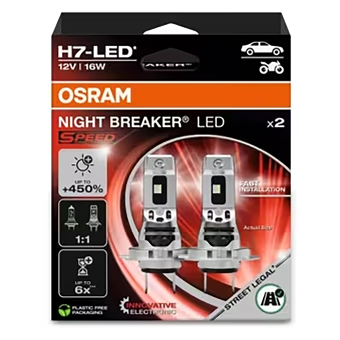 OSRAM’s blændingsfri lyskontrol reducerer generende genskin for modkørende med op til 50 %, mens den skarpe lysafgrænsning sikrer et præcist og behageligt lysbillede. Night Breaker LED Speed er samtidig en energieffektiv løsning, der bruger op til 60 % mindre strøm end traditionelle halogenpærer og har op til seks gange længere levetid – godt for både miljøet og pengepungen.