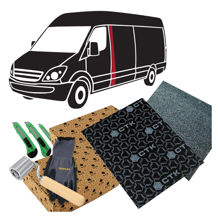 Denne støjdæmpningspakke indeholder nok materiale til at støjdæmpe bagvæggen / Varerumsadskillelse på de mest gængse varebiler som: Fiat Ducato, Peugeot Boxer, Citroen Jumper, Renault Master, Toyota Proace, Peugeot Expert, Citroen Jumpy, Mercedes Vito, VW Transporter, Ford Transit, VW Crafter, Mercedes Sprinter, MAN TGE og Iveco Daily.